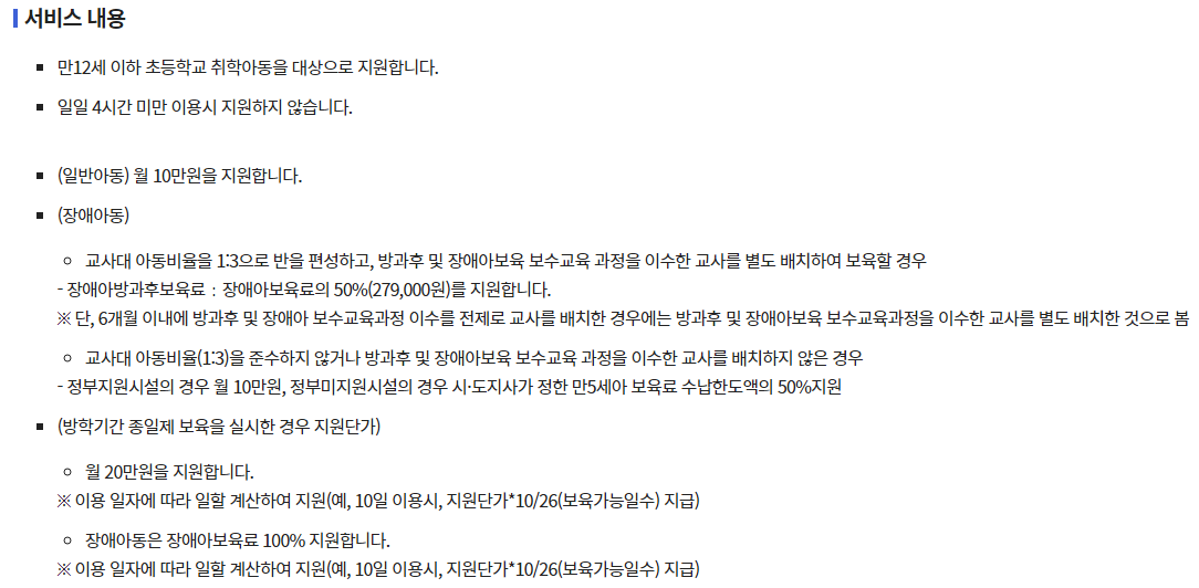 ■ 차상위 이하(법정 저소득층 포함)및 장애아동에 해당되는 취학아동이 방과후에 어린이집을 일일4시간 이상 이용하는 경우 지원합니다.