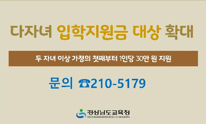 경남교육청, 다자녀 입학지원금 대상 확대